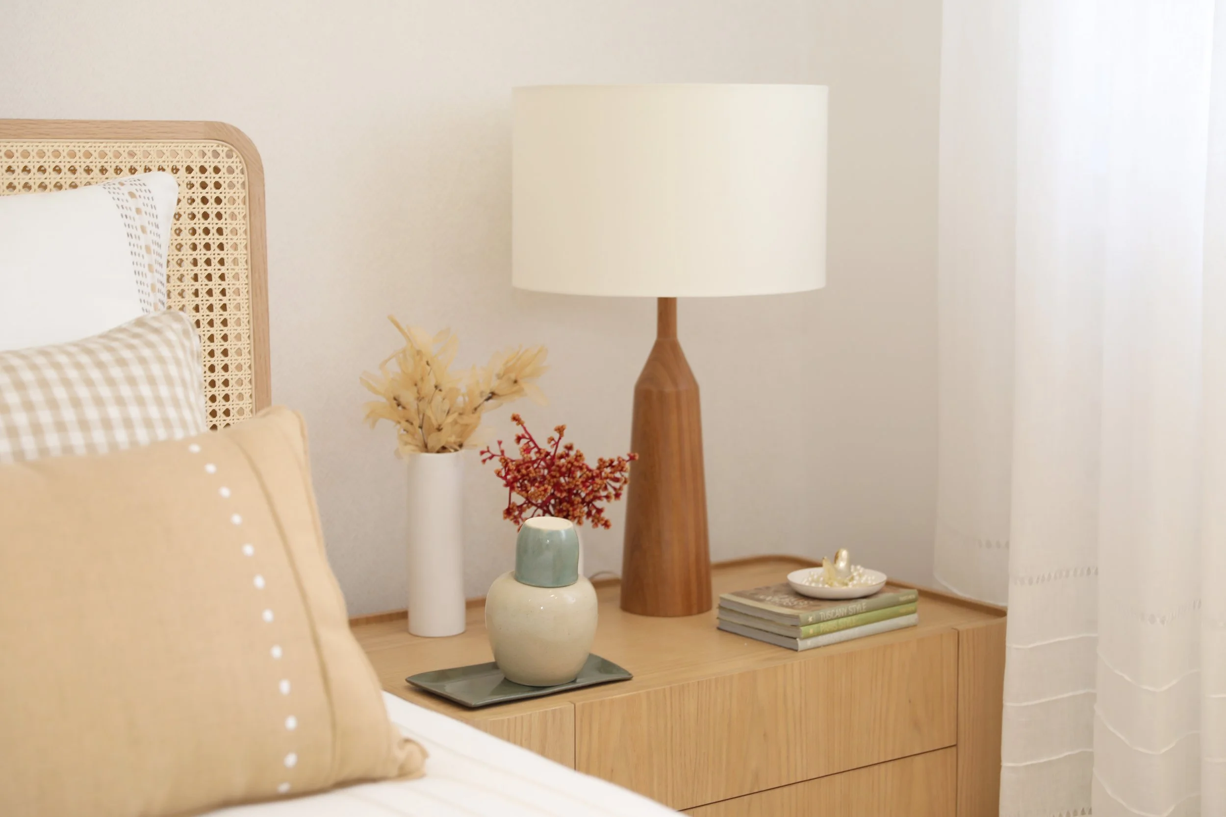 Estrutura em madeira com linhas curvas. Pé em madeira e cabeceira com gomos estofados.